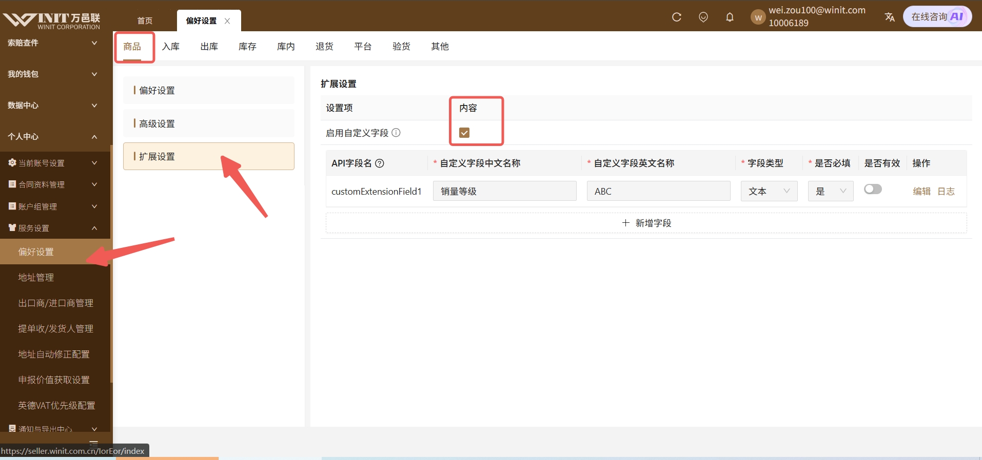 通过万邑联 > 个人中心 > 偏好设置 > 商品设置 > 扩展配置 >启用自定义字段