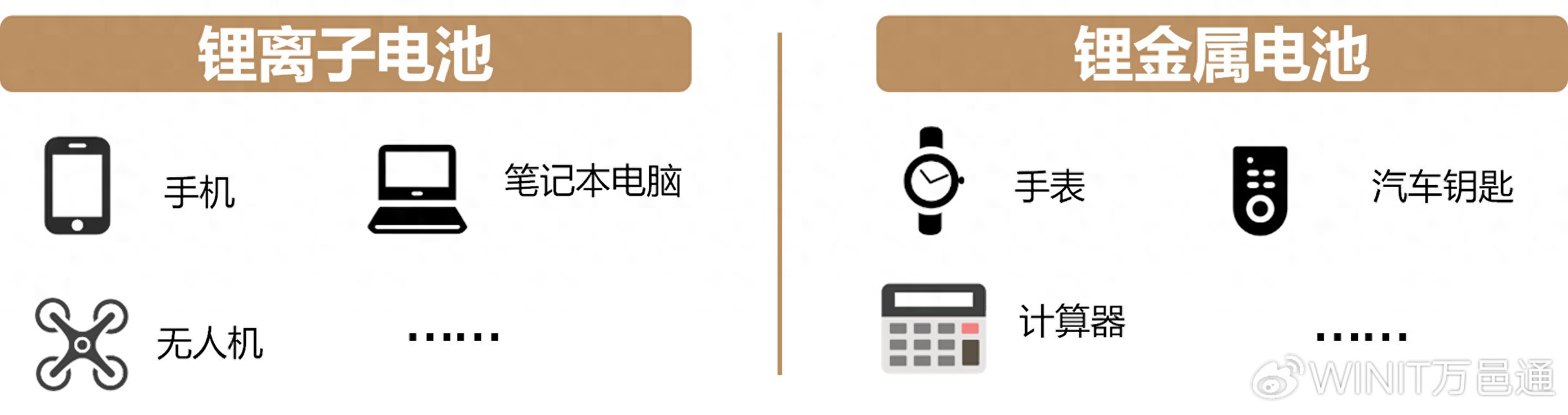 - 锂金属电池:一次性使用,以金属锂为负极,通过锂的氧化还原反应产生电流,能量密度极高。常见于手表、计算器、汽车钥匙等产品。