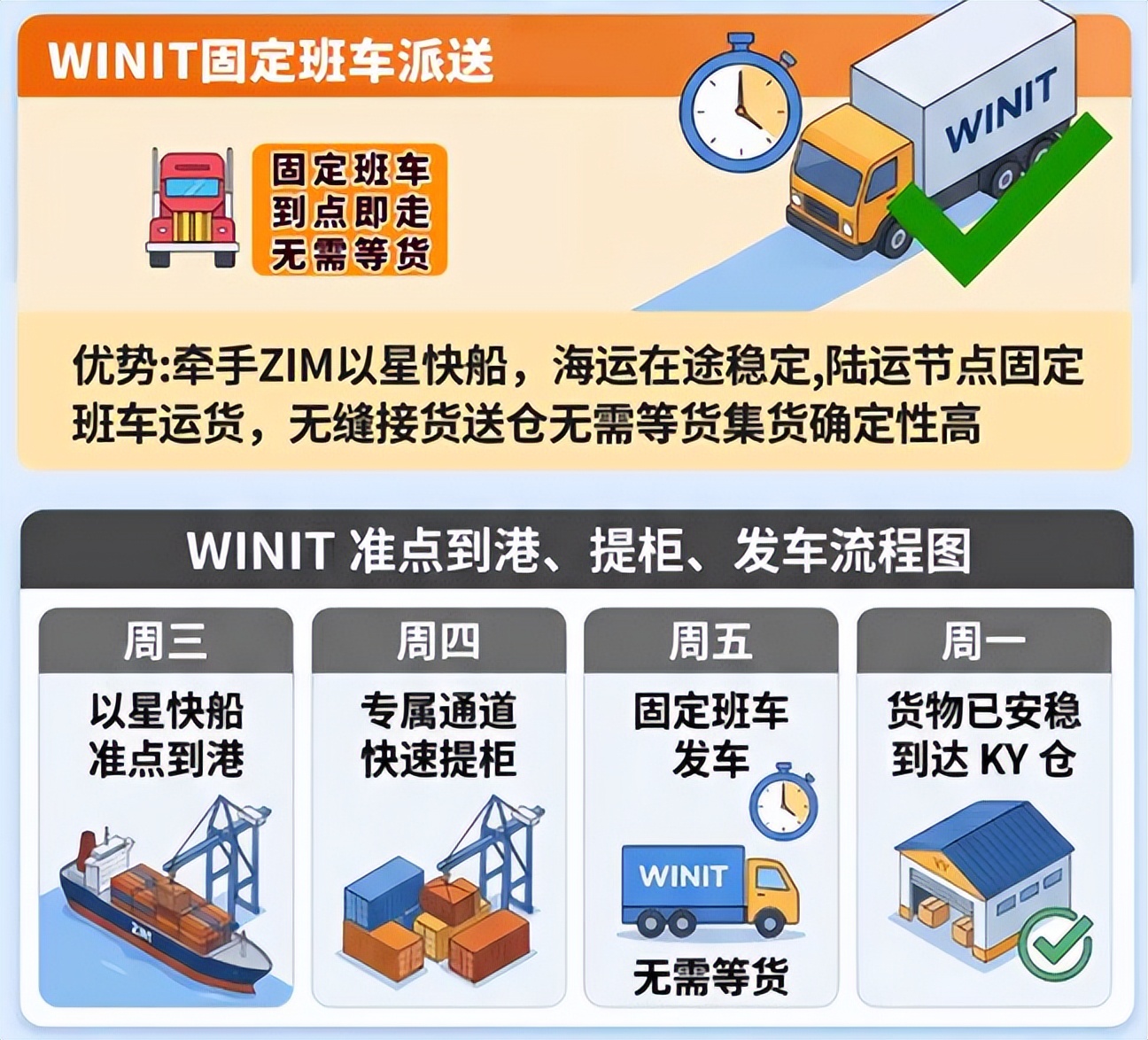 万邑通联手以星ZIM创新推出固定班车派送体系,依托以星ZIM快船稳定的在途运力,搭配陆运节点固定班车运货,到点即走、无缝接货送仓,实现头程海运的“公式化”精准交付,真正做到了“稳、准、快”: